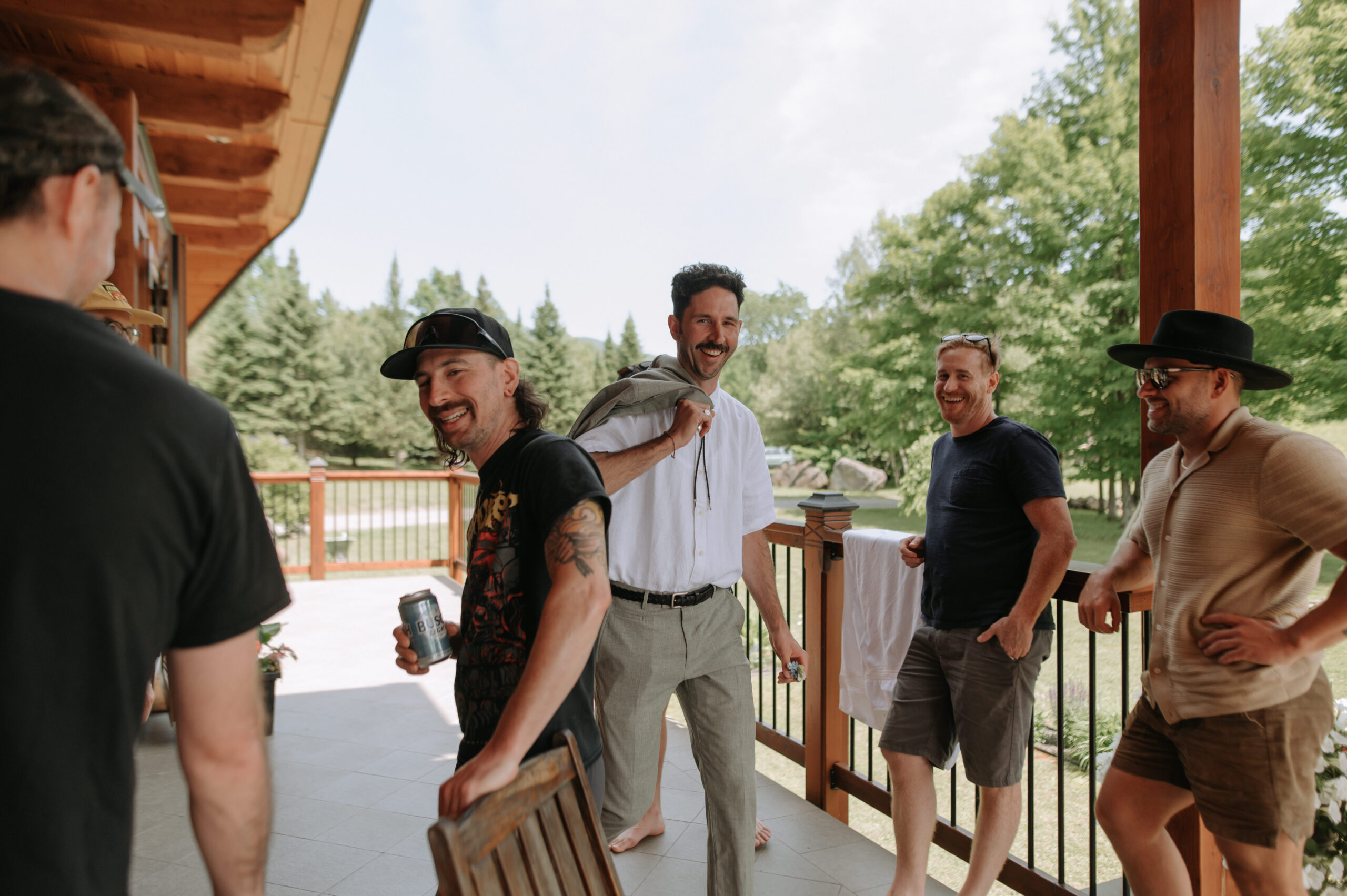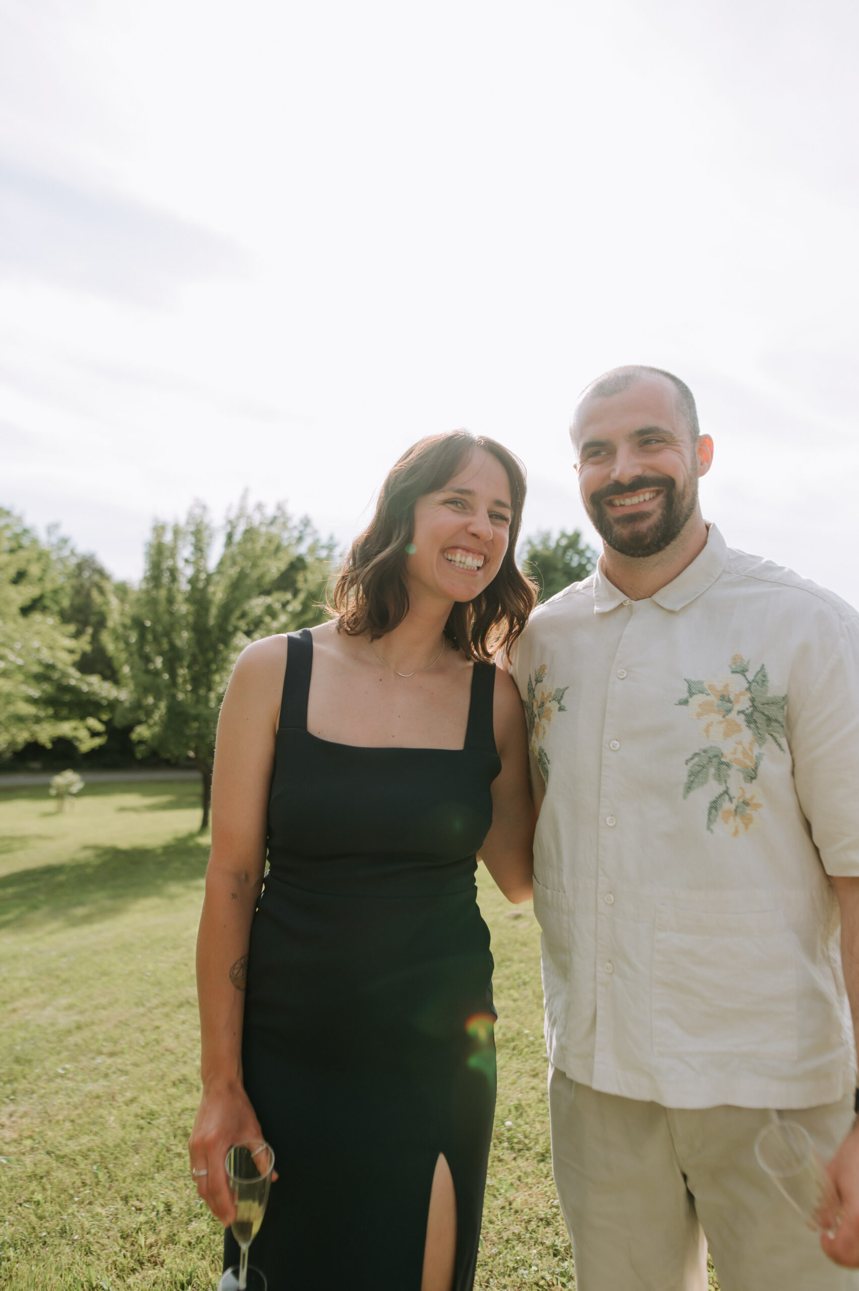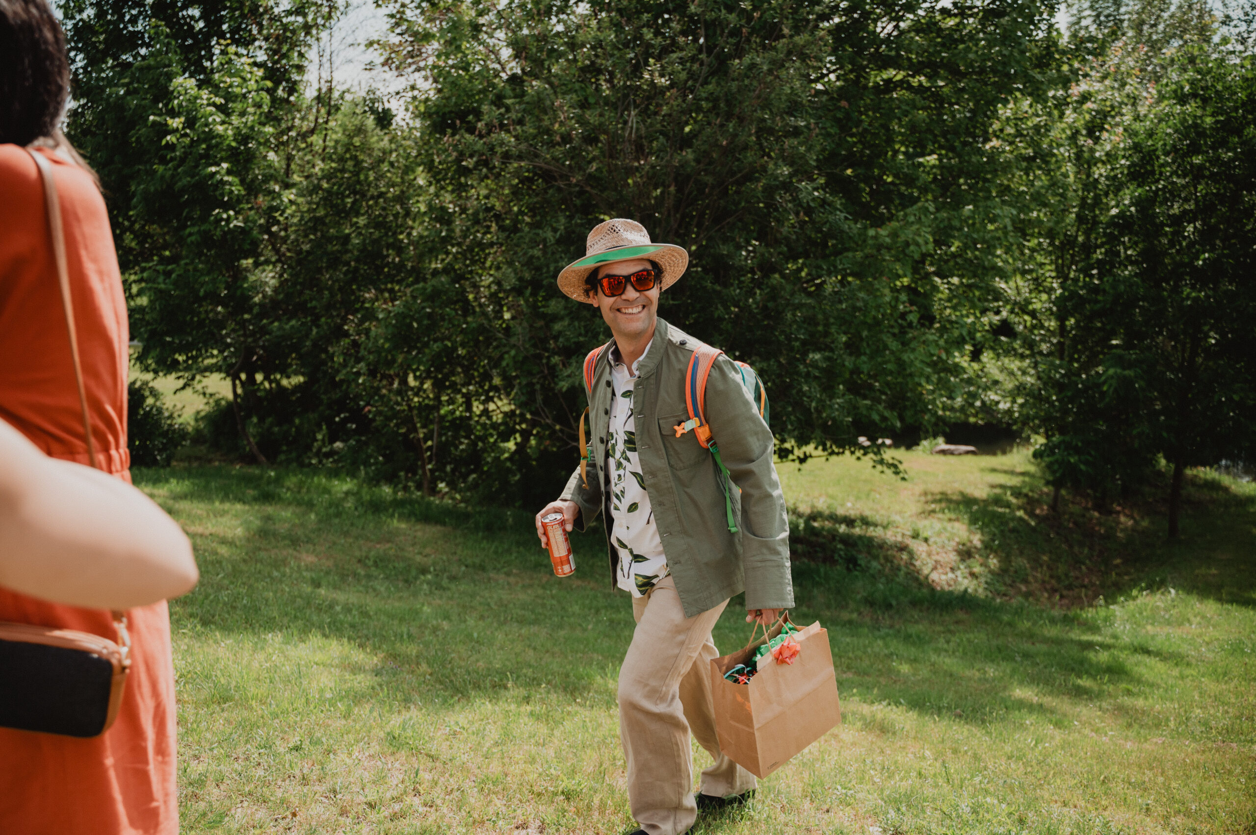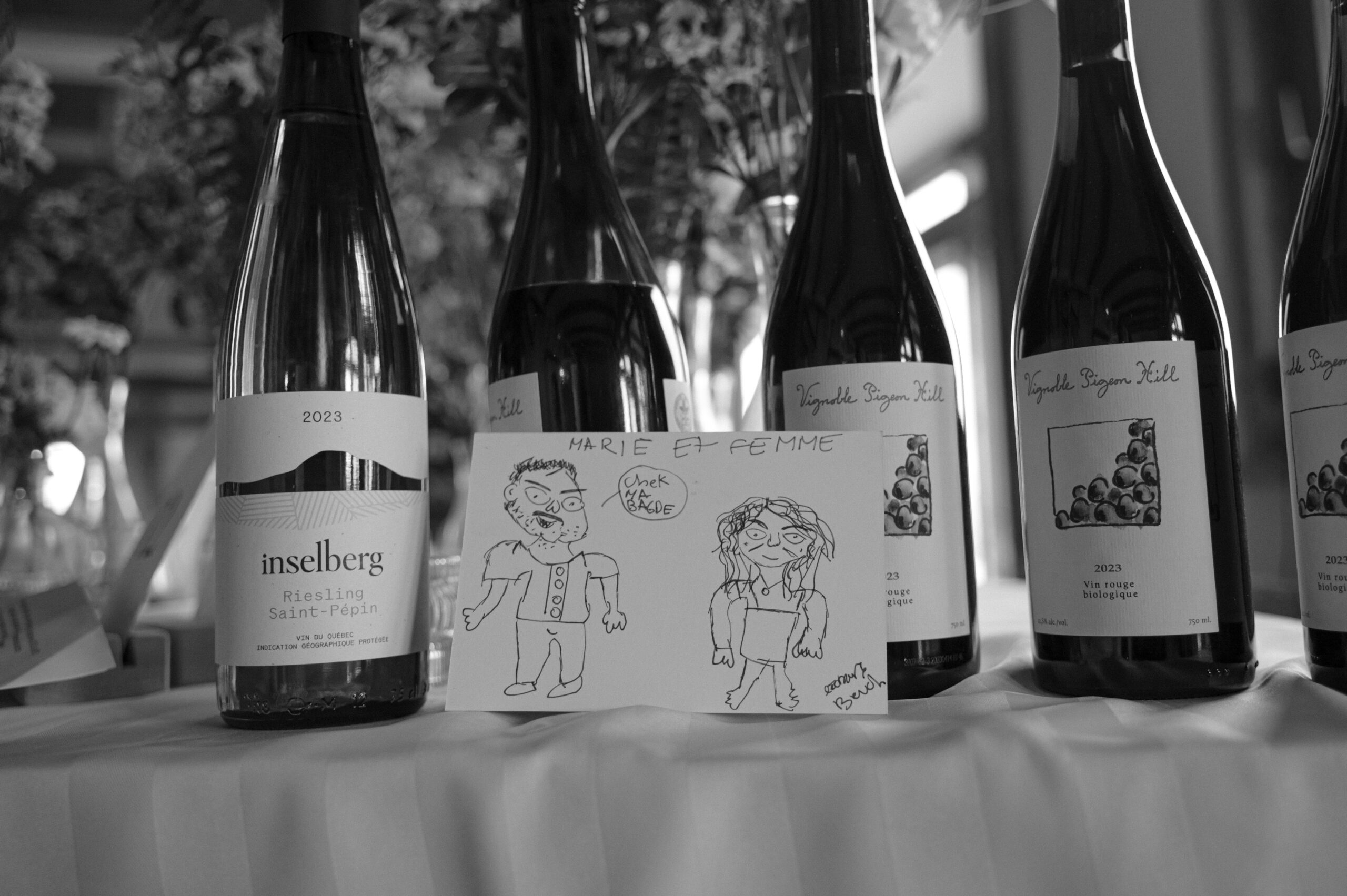 Ces deux-là savent s’entourer et mettre en valeur le talent de leurs amis. Ils ont choisi un domaine situé à Sutton, en Estrie, un lieu cher à leur famille, en pleine nature, parfait pour des amateurs de plein air comme eux. La bière provenait de leurs amis de GasparD et Messorem, brassant deux des meilleures IPA du Québec, les illustrations étaient signées par l’une des invitées, Mariève Ledoux, et le vin était québécois (une évidence pour Halina, qui le défend depuis toujours.) Entourés d’amis impliqués dans la décoration et l’organisation, ils ont créé une journée profondément humaine.