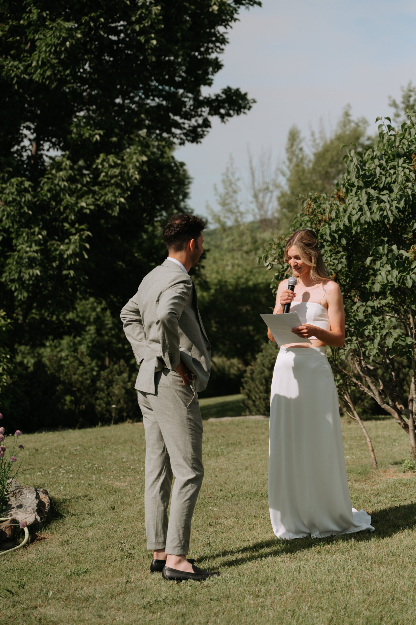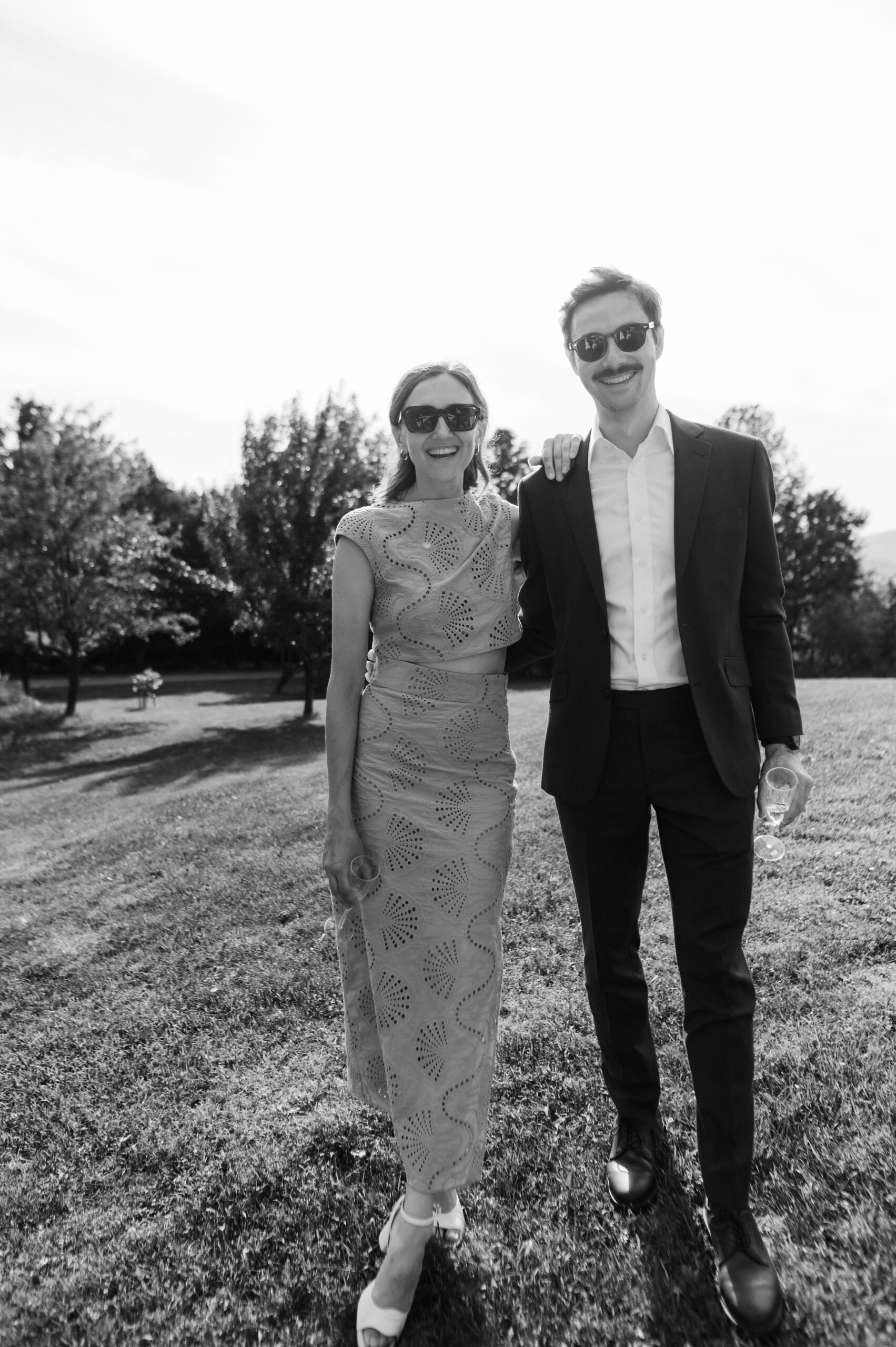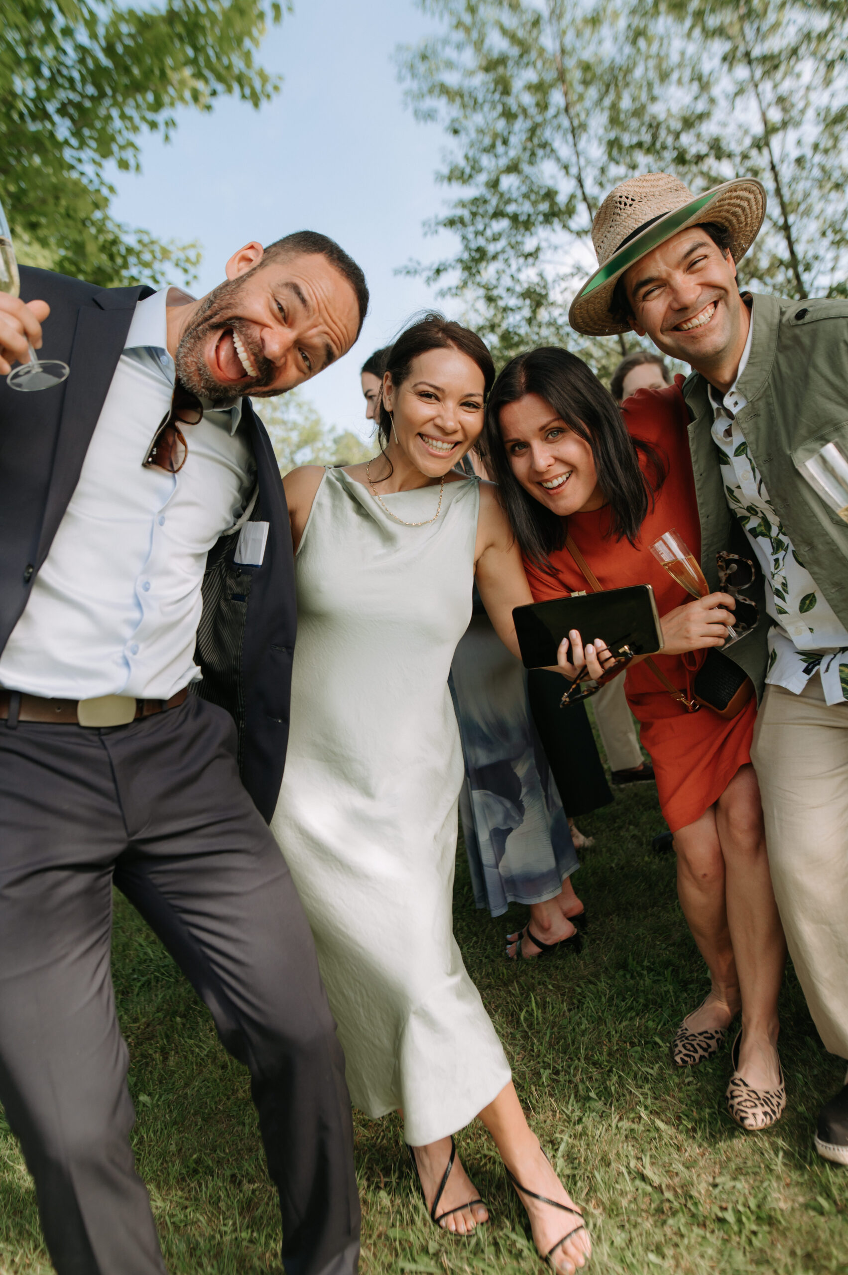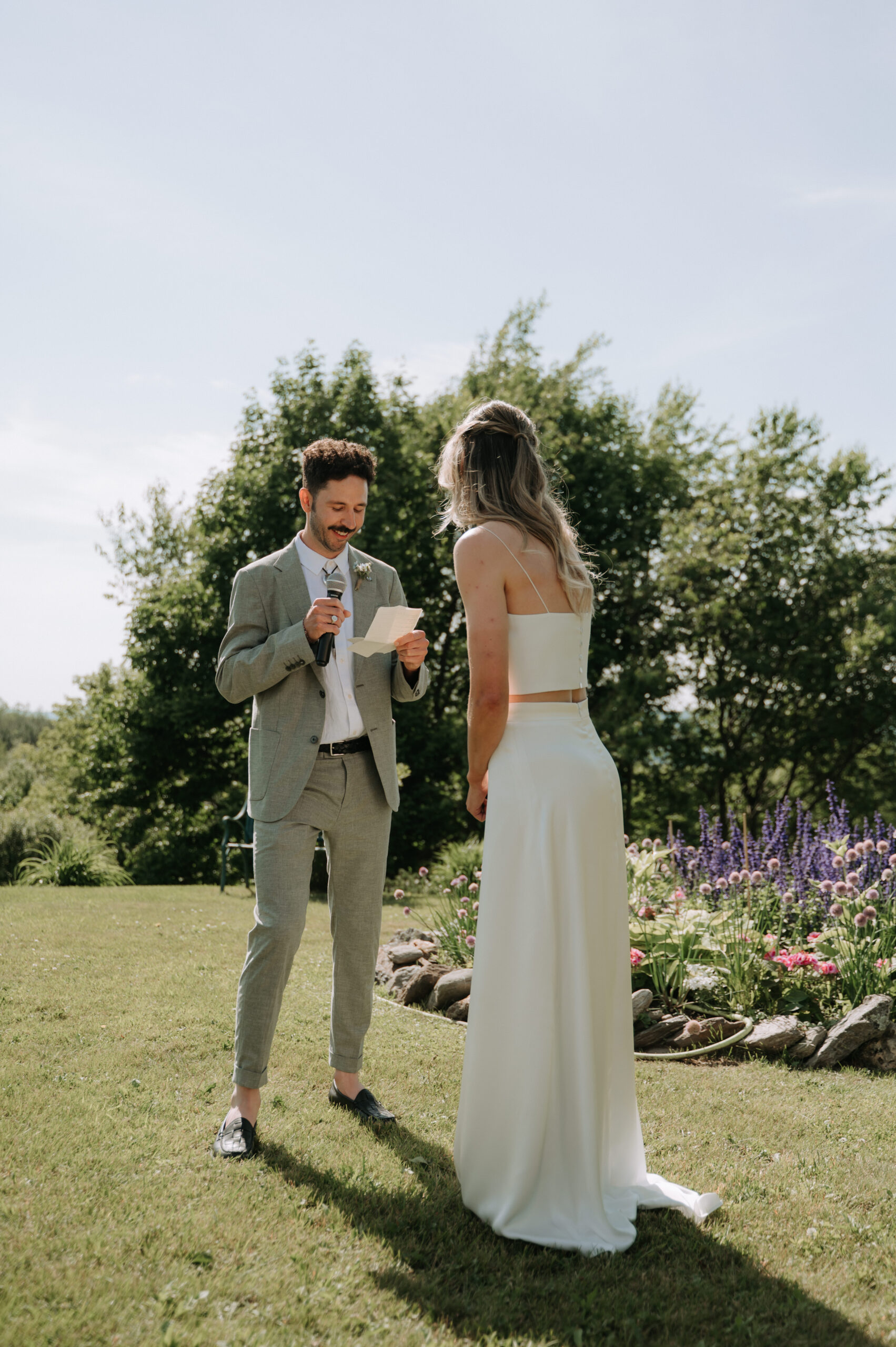 Ces deux-là savent s’entourer et mettre en valeur le talent de leurs amis. Ils ont choisi un domaine situé à Sutton, en Estrie, un lieu cher à leur famille, en pleine nature, parfait pour des amateurs de plein air comme eux. La bière provenait de leurs amis de GasparD et Messorem, brassant deux des meilleures IPA du Québec, les illustrations étaient signées par l’une des invitées, Mariève Ledoux, et le vin était québécois (une évidence pour Halina, qui le défend depuis toujours.) Entourés d’amis impliqués dans la décoration et l’organisation, ils ont créé une journée profondément humaine.